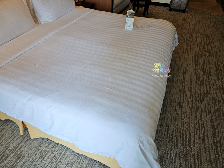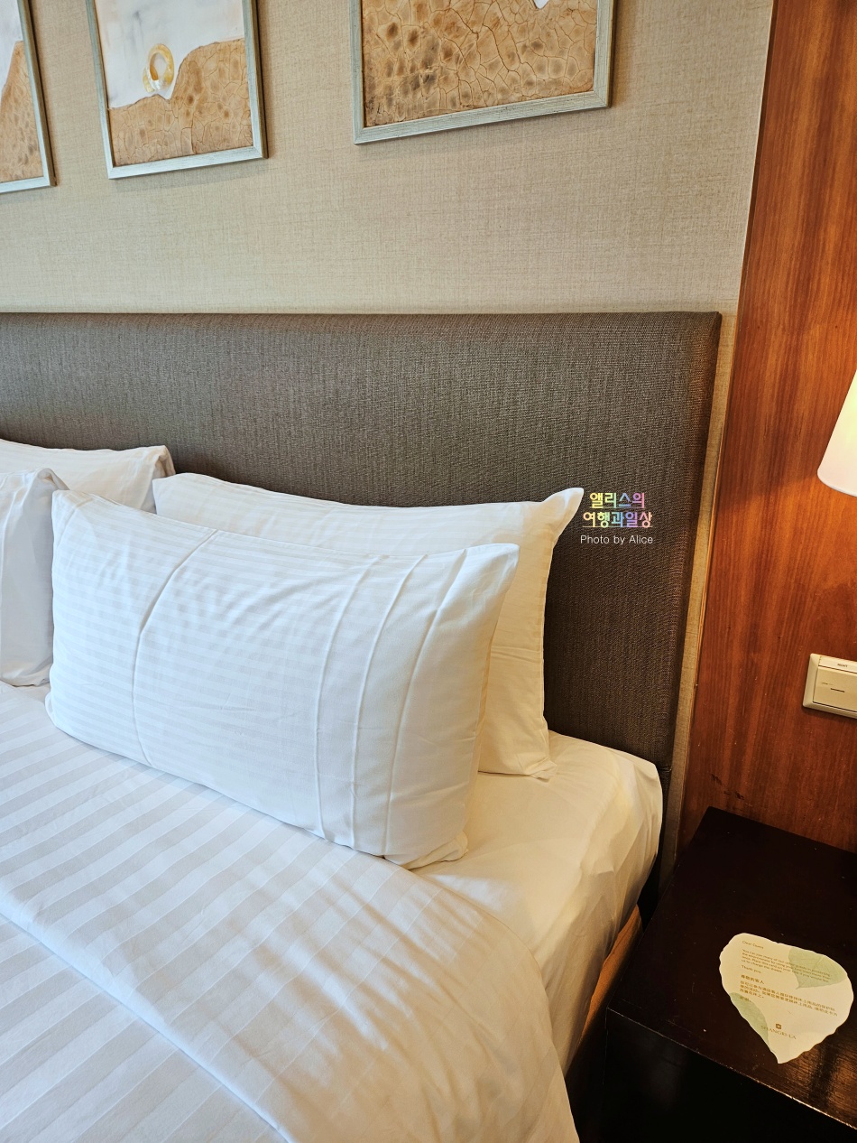 킹베드 답게 사진상으로 한 컷에 담느라 좀 작아 보이지만 실제로 그리 작지 않고 매우 컸다. 딱 봐도 푹신해보이는 매트리스의 느낌을 풍기던 곳.