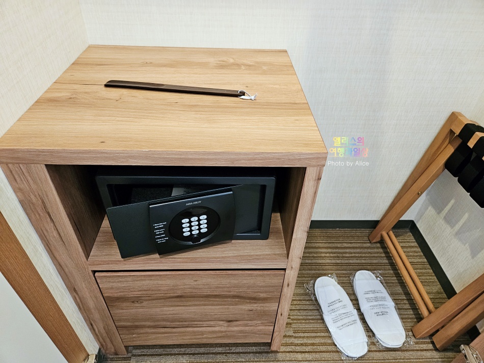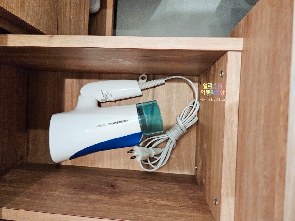 옷장 바로 옆에 추가 수납장이 있다. 추가 수납장의 경우 신발이나 기타 수납공간으로 사용할 수 있는 작은 수납장과 다림질 상판대 그리고 추가 공간. 개인짐을 둘 수 있어서 객실을 보다 쾌적하게 사용할 수 있다.