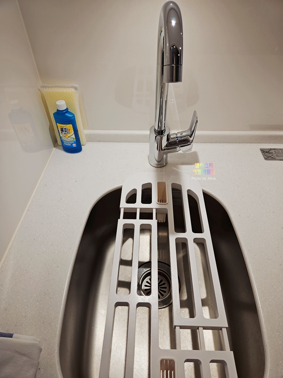 냉장고 용량도 큰 편이라 좋아하는 과일을 사놓고 충분히 보관할 수 있었고 싱크대 상판은 깔끔하게 티메이커들이 세팅되어 있었다.