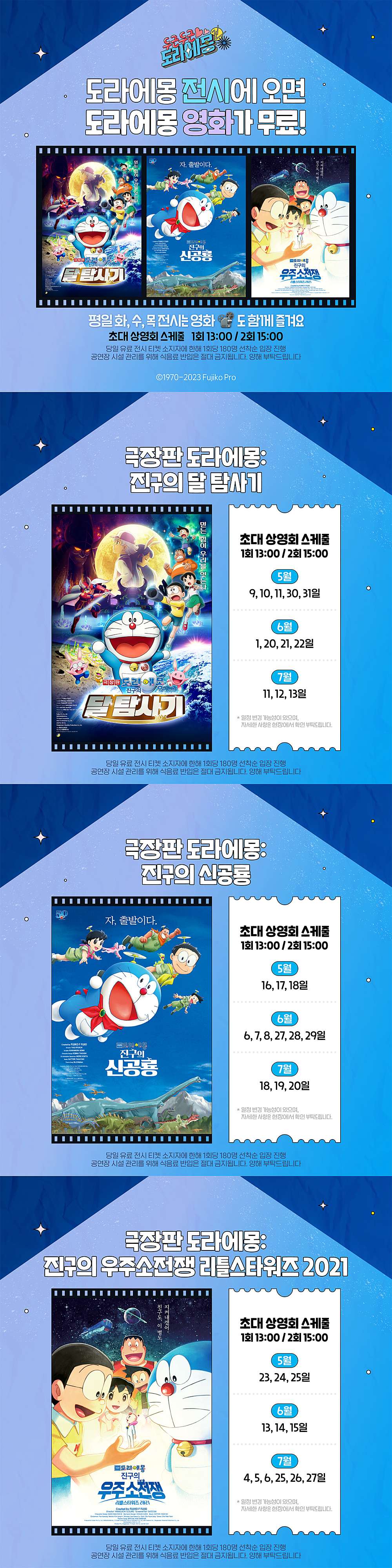 도라에몽과 진구, 이슬이 등 인기 캐릭터에서부터 도라에몽의 비밀 도구에 이르기까지 애니메이션 도라에몽의 스토리를 떠올릴 수 있는 다양한 요소들로 구성한 △도라에몽 아트 포토존 △도라에몽 4차원 주머니존 △도라에몽 스토리존 등 크게 3가지 섹션으로 나뉜다. 평일 화, 수, 목 전시는 도라에몽 영화도 함께 즐길 수 있다.