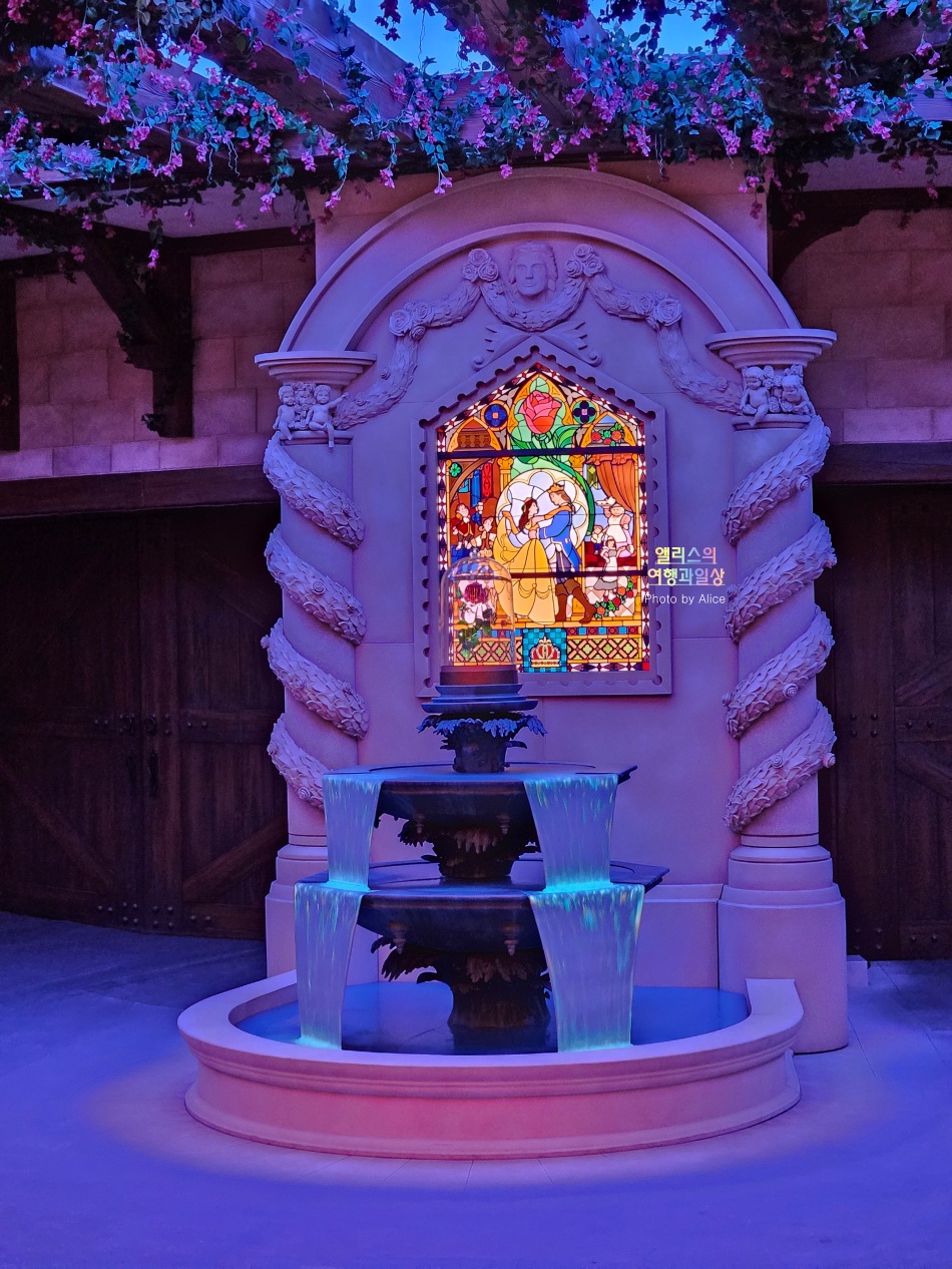 안으로 입장하면 일부 인원이 먼저 성안으로 들어가게 된다. 이때 미녀와 야수에 대한 이야기를 간략하게 접할 수 있다. 성 내부에 있는 스테인글라스 창을 통해서 시시각각 이야기에 따라 변하며 미녀와 야수 이야기를 해준다. 물론 조금 더 입체적으로 각 코너에 주인공들도 실제로 나타난다. 꽤나 꼼꼼하게 준비한 것이 입장하면서 느낄 수 있었다.
