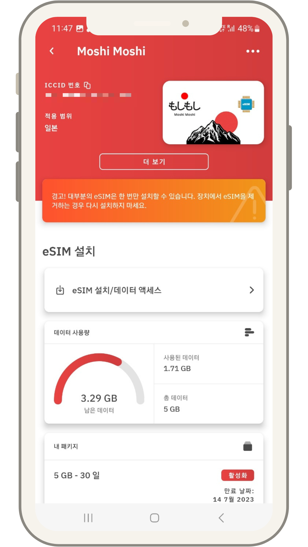 매번 해외에 나갈 때마다 그전에는 유심을 사용했었는데, 갤럭시 S23으로 교체한 후로는 이심 eSIM으로 대체할 수 있어서 여러모로 편리했다. 물리적인 유심을 장착하는 과정에서 발생하는 불편한 점등은 모두 해소된 데다가 추가로 eSIM 이심을 사용하면 필요한 데이터를 언제든지 추가 충전할 수 있어서 무척 편리했다.