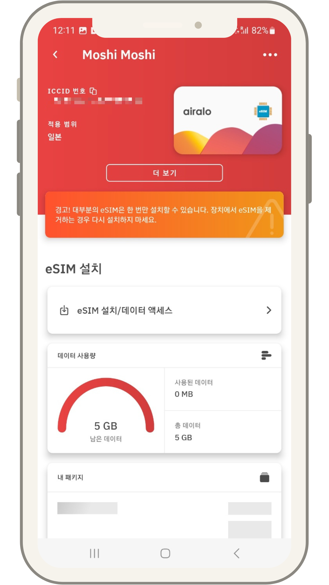 에어알로 마이페이지에서 구매한 QR코드를 확인할 수 있다. 그리고 그 아래 이심 장착방법을 설명해 두었는데 복잡할 것 없이 그냥 설명 그대로 실행하면 해외에서 데이터를 사용할 수 있다.