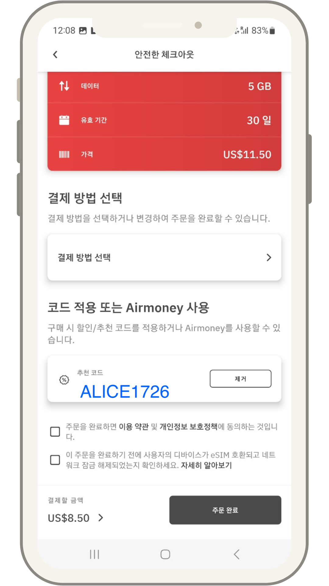 이 할인코드가 상당히 유용해서 꽤나 저렴하게 이심을 구매할 수 있어서 정말 편리했다.