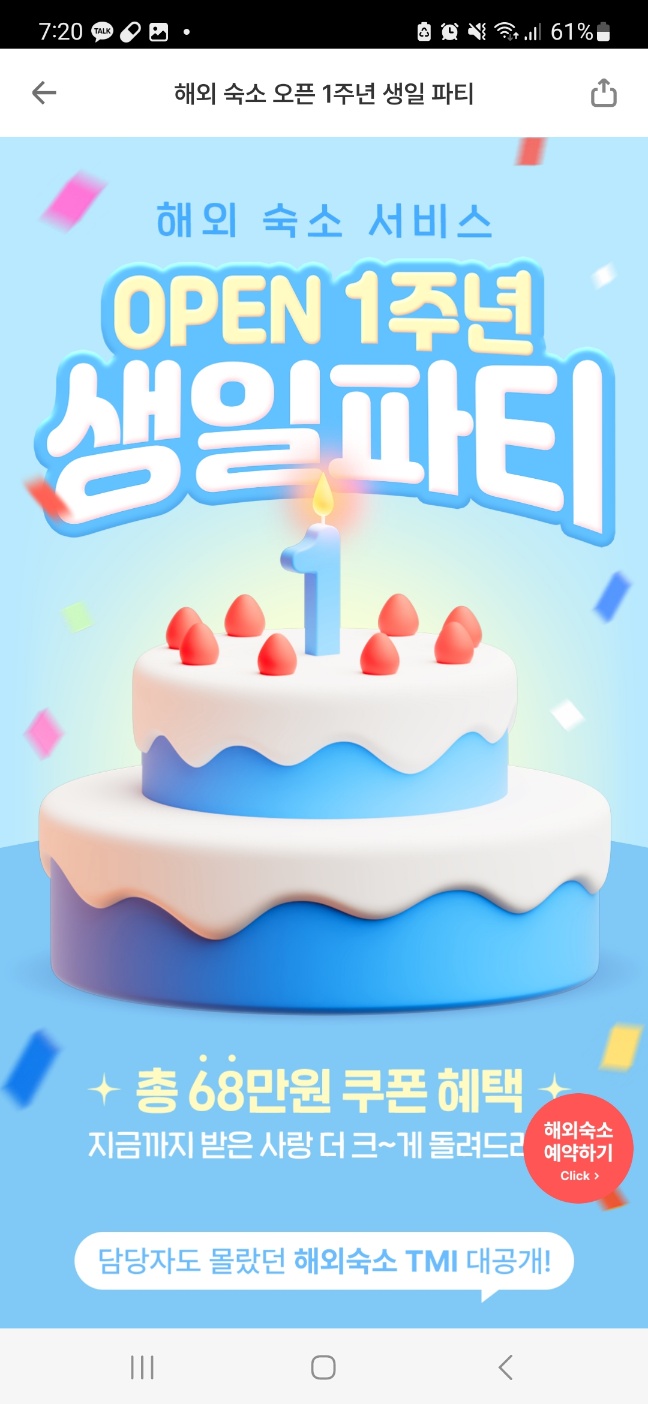 해외숙소 오픈 1주년 기념으로 진행하는 이벤트로 다양한 할인쿠폰이 무차별 폭격되는 즐거운 이벤트다. 종류도 다양하니 참고해서 해외여행을 계획한다면 꼭 활용해보시길