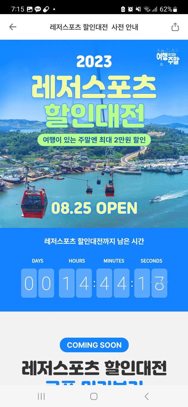 주말엔 최대 2만원 까지 할인받을 수 있는 이벤트로 여행이 있는 주말이라는 슬로건 아래 매월 넷째주 주말은 쿠폰을 이용해서 저렴하게 레저/스포츠 관련 입장권/액티비티를 예약할 수 있다.