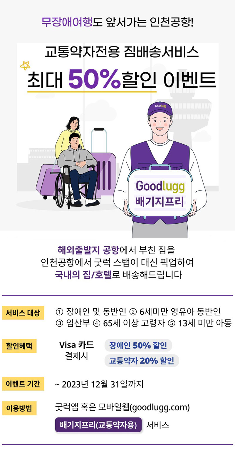 - 이용방법: 굿럭앱 혹은 모바일웹 goodlugg.com 배기지프리(교통약자용) 서비스