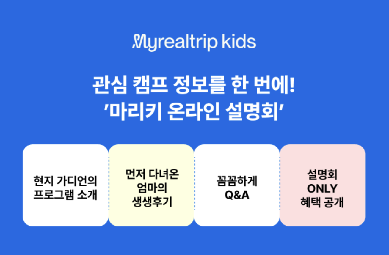 마이리얼트립의 가장 큰 장점은 다양한 니즈를 충족시킨다는 점이다. 특히 여기저기서 얻기 어려운 해외 영어캠프 역시 주기적으로 정보를 확인할 수 있고 실제 먼저 다녀온 참여자들의 생생한 후기도 확인할 수 있어서 선택하는 데 큰 도움이 된다.