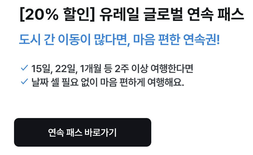 유럽 여행에서 필수품인 유레일 글로벌 패스. 유럽은 여러나라가 붙어있어서 다양한 지상 교통편이 자유롭게 오가는 것이 특징이다. 하지만 유럽 특성상 교통비가 비싸기에 단시간에 많은 이동을 해야 하는 여행자들에게는 부담이 되기도. 이럴 때는 각 나라 안에서 또는 여러 나라를 오가면서 유용하게 사용할 수 있는 기차를 부담 없이 이용할 수 있는 유레일 글로벌 패스가 현대 마이리얼트립에서 20% 할인 판매 중이다.
