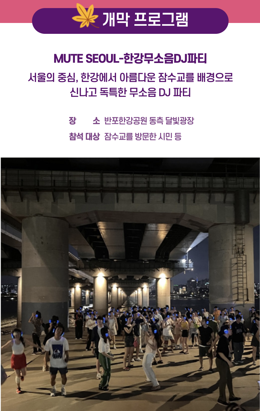 - 개막프로그램 : MUTE SEOUL-한강무소음DJ파티, 서울의 중심 한강에서 아름다운 잠수교를 배경으로 신나고 독특한 무소음 DJ파티