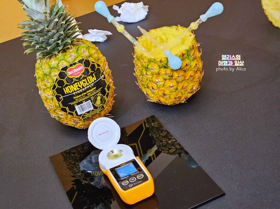 나는 인스타그램을 운영하지 않아서 파인애플 스틱+에코백 제공 이벤트에 참여할 수 없었고, 다만 현장에서 간단한 퀴즈 맞추고 파인애플 모양 장바구니 증정과 함께 허니 글로우 파인애플 무료 시식을 할 수 있었다. 진짜~~~~ 달콤하고 맛있었던 허니 글로우 파인애플. 15~6브릭스라고 하니 정말 당도가 높았다. 기회가 되면 사먹을 예정. 맛에 대한 보장이 확실한 파인애플이 아닌가 싶다.