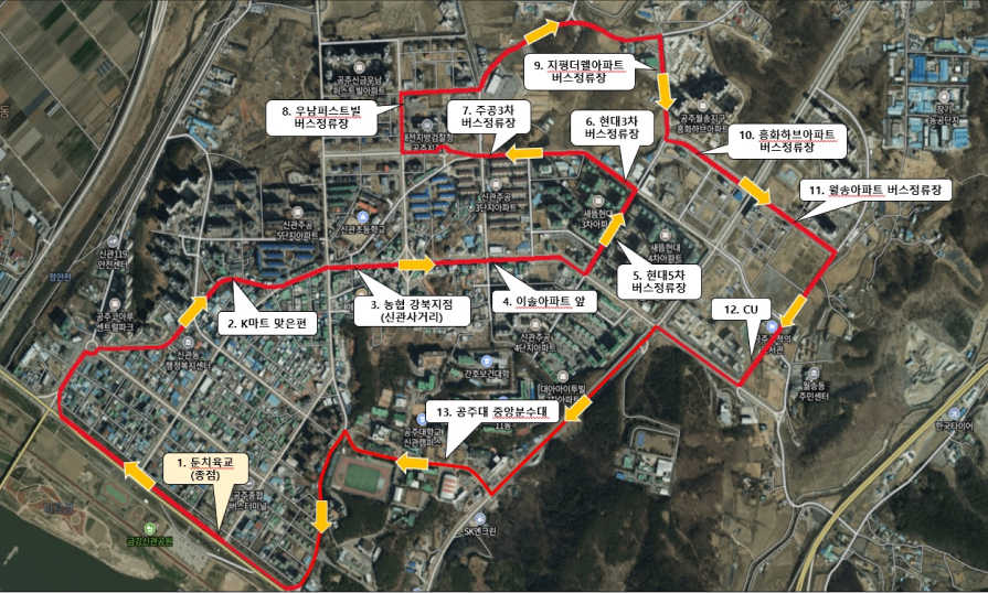 - 노선❷: 둔치육교 - k마트 맞은편 - 농협 강북지점(신관사거리) - 이솔아파트 앞 - 현대5차 버스정류장 - 현대3차 버스정류장 - 주공3차 버스정류장 - 우남퍼스트빌 버스정류장 - 지평더웰아파트 버스정류장 - 홍화허브아파트 버스정류장 - 월송아파트 버스정류장 – CU편의점 - 공주대 중앙분수대 - 둔치육교