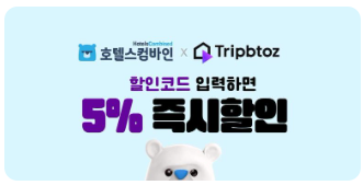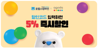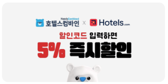 호텔스닷컴을 통해서 호텔 예약시 추가로 적용할 수 있는 5% 할인코드가 있다. 이왕이면 동일 조건 더 저렴하게 예약하길 추천한다.