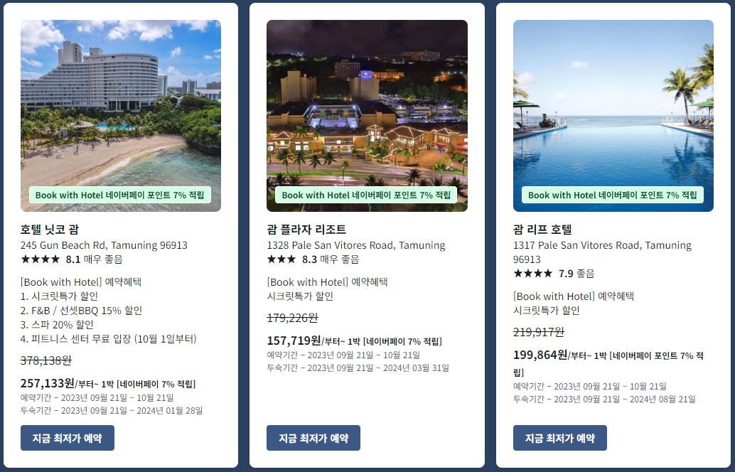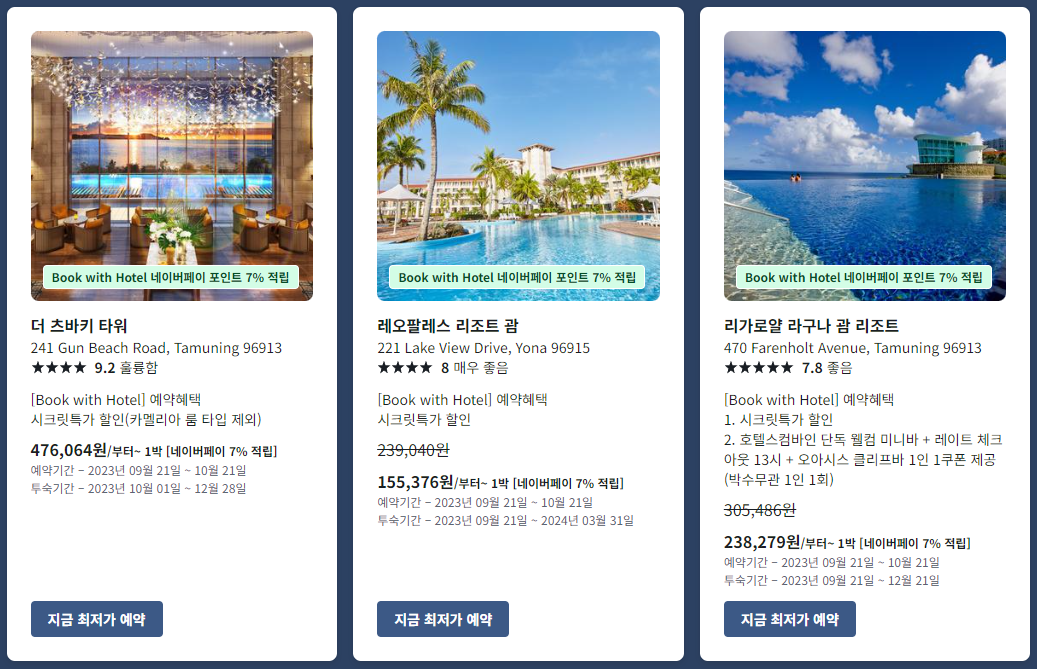 - 괌 호텔 세일 기간: 2023년 10월 21일까지 예약 가능