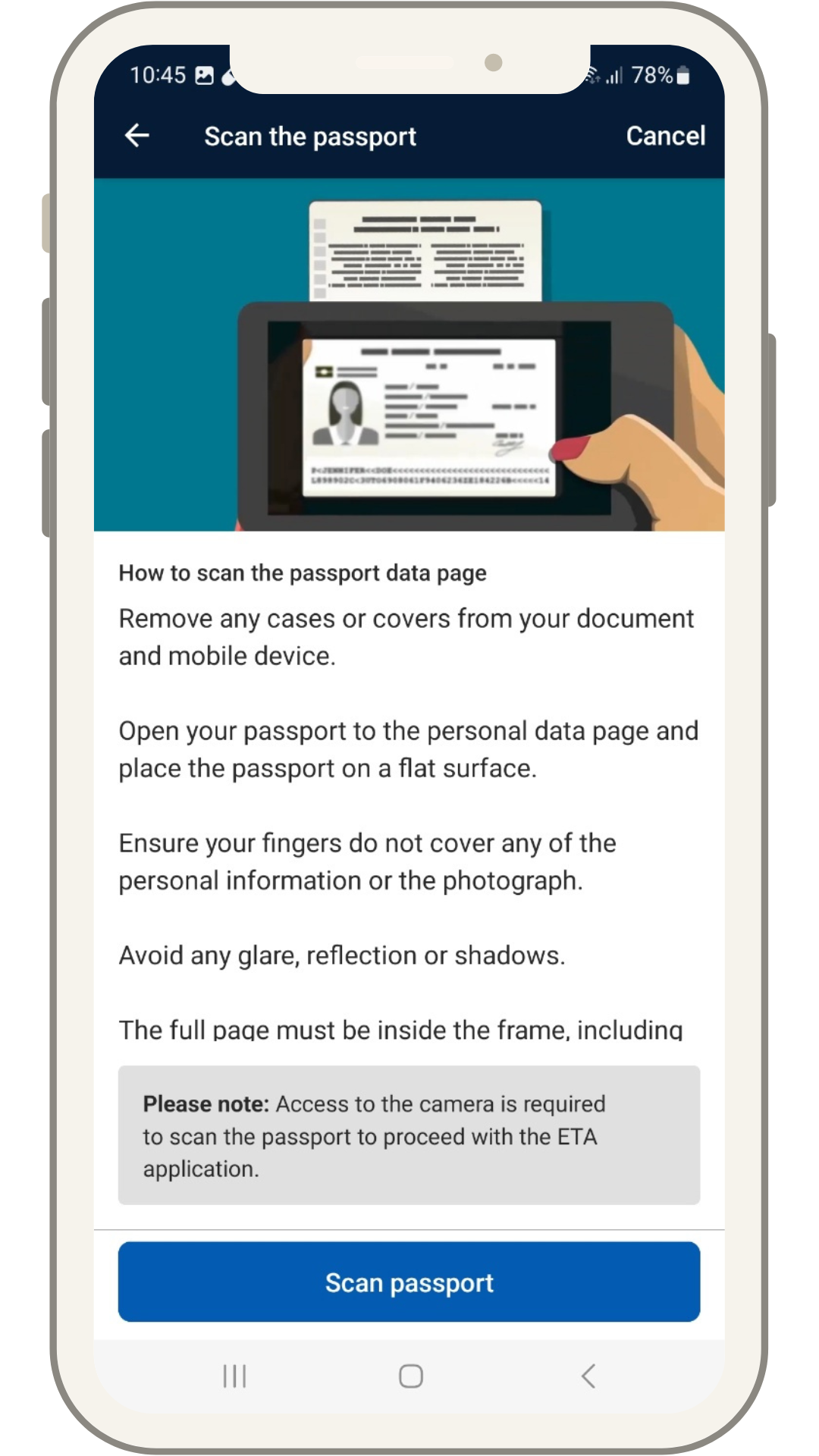 카메라로 신청자 여권정보 스캔 - 스마트폰을 전자여권의 칩 있는 부분에 천천히 밀면서 칩 인식 - 자동으로 기재된 신상정보와 여권정보 동일한지 확인 - 신청자의 사진촬영(조명이 밝은 배경 앞에서, 테가 두껍지 않은 안경착용가능) - 이메일 인증 - 프로필 확인 및 저장 - ETA질문지 응답 - 기기에 따라 구글페이/애플페이/신용카드 중 결제