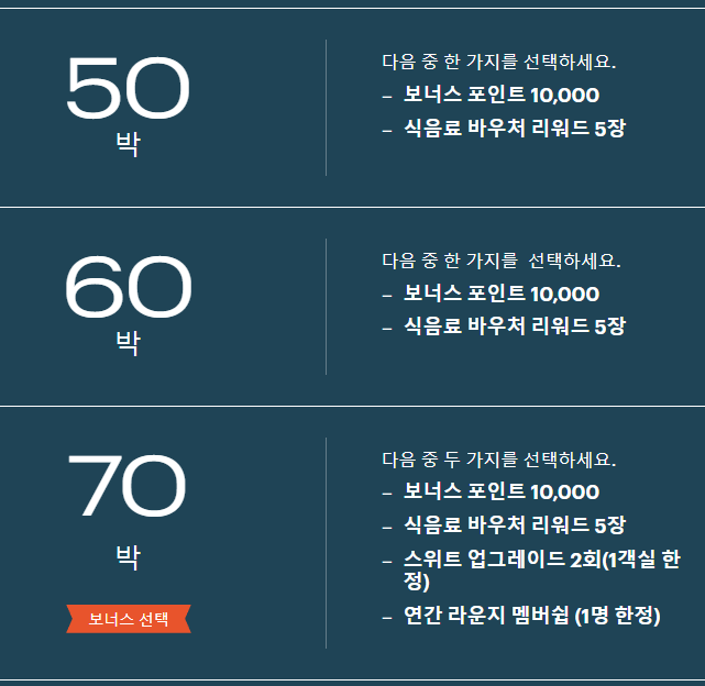 20박 숙박시 보너스 포인트 5,000 / 식음료 바우처 리워드(20달러) 2장 / 스위트 업그레이드 확정 1회 (최대 5박까지 가능)중에서 원하는 혜택을 선택할 수 있다. 하늘색 표시는 일반 룸을 유상예약하더라도 호텔에서 허락한다면 최대 5박까지 스위트룸을 이용할 수 있는 이용권이라 세가지 혜택 중에서 가장 가치를 잘 활용할 수 있어서 표시했다.