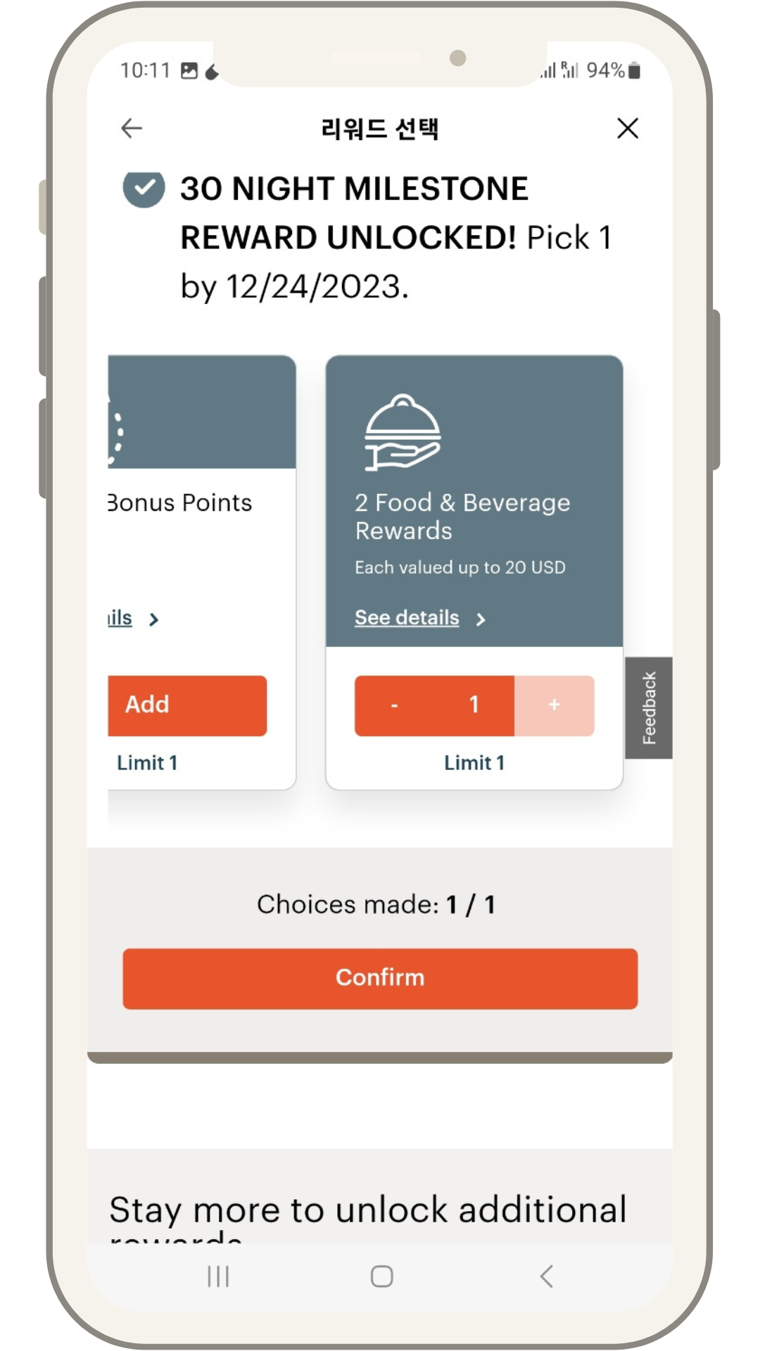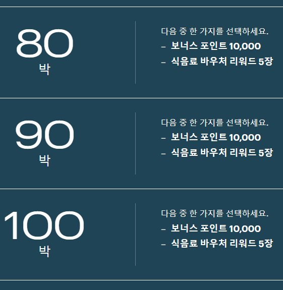 나의 경우 20박에는 스위트 업그레이드권, 30박에는 20달러 식음바우처 두 장을 리워드 혜택으로 선택했다. 그리고 40박에는 당연히 "연간 라운지 멤버십"를 선택할 예정이다.