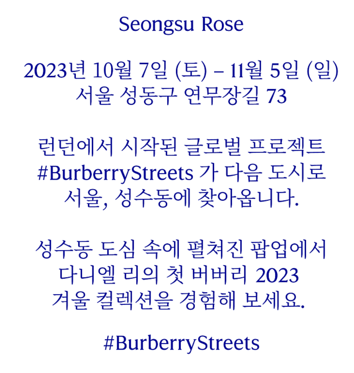 성수 로즈에선 신임 크리에이티브 디렉터 다니엘 리의 첫 버버리 컬렉션인 ‘2023 겨울 컬렉션’을 선보이는 공간이다. 컬렉션의 주요 테마인 ‘잉글리쉬 로즈’에서 영감을 얻어 장미 꽃잎 모양으로 매장 내부를 꾸미고, 옷·가방·신발· 주얼리 등 컬렉션 전반을 보여준다.