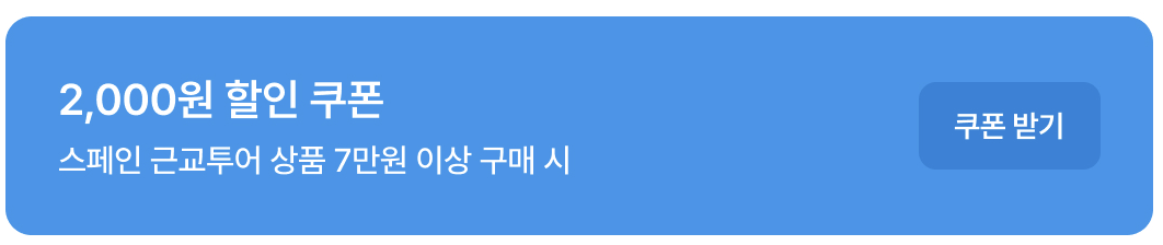 매력적인 풍경을 가진 바르셀로나 근교, 화려함을 포함한 마드리드 근교, 그리고 유럽 정취를 그대로 담아낸 세비야 근굑짜. 스페인 근교 여행을 계획중이라면 꼭 할인쿠폰 사용해서 할인받아 여행을 즐기자!