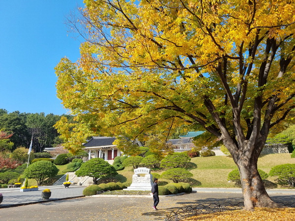 입구로 들어서면 본전으로 향하는 가운데 길 양편으로 여름에 붉은 잎을 풍성하게 피워냈던 배롱나무가 익어간다. 오른쪽으로는 수령이 오래된 느티나무가 화사하게 노란빛을 뽐내고, 왼쪽으로는 연못을 감싸는 붉고 노란 단풍과 수양버들이 시민 휴식처가 돼주고 있다.