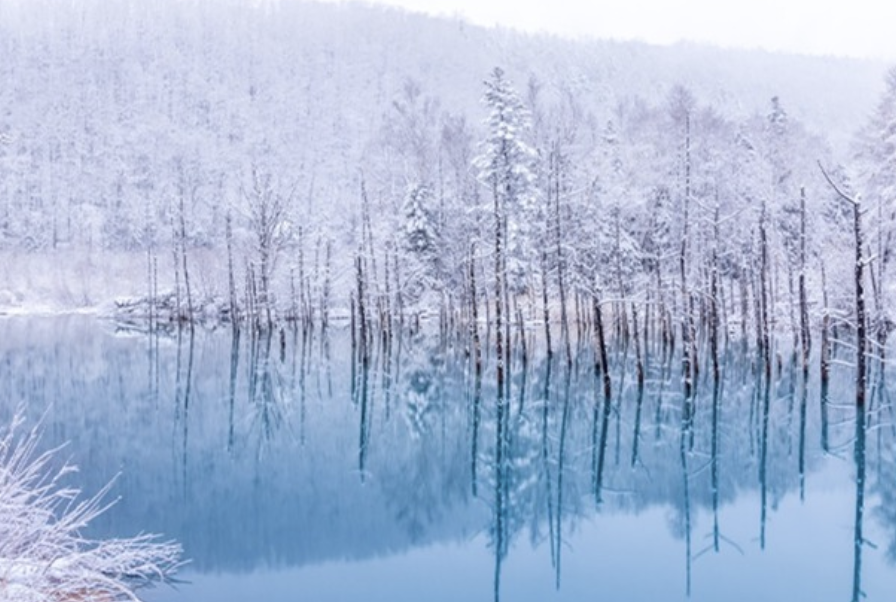 비에이의 시로가네 온천 부근에 있는 아오이 이케. 파란 수면과 마른 자작나무, 자연이 이뤄낸 신비로운 풍경에 넋을 일고 바라보게 되는 인기 관광 명소이다.