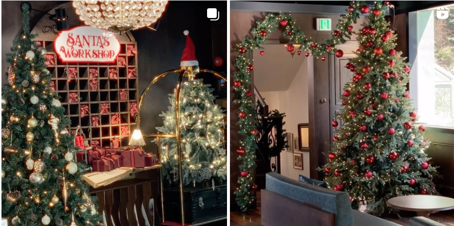 멀리서부터 눈에 확 들어오는 대형트리가 카페 앞에서 반짝이고 있고 , 안으로 들어가면 카페 내부 천장 가득 크리스마스를 상징하는 빨강, 초록, 금색의 오너먼트 장식볼이 달려있다. 따뜻하고 불멍 할 수 있는 화로도 있다.
