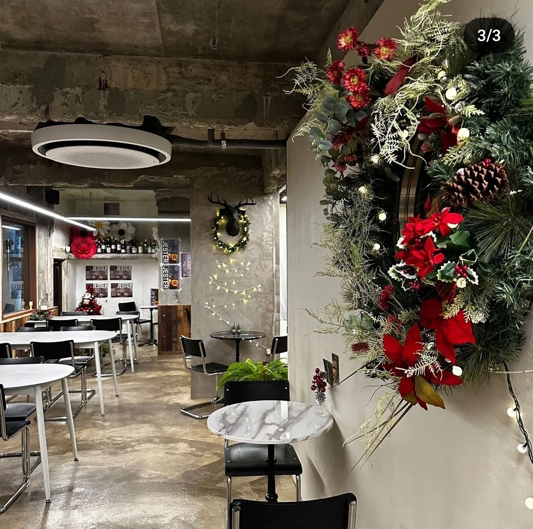 바나나푸딩 맛집 해리단길 카페 제스터는 작년보다 훨씬 커진 대형 크리스마스트리와 산타가 두고 간 것 같은 선물모양 조명, 그리고 내부에는 크리스마스 리스를 벽에 달아두었다.
