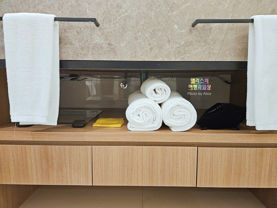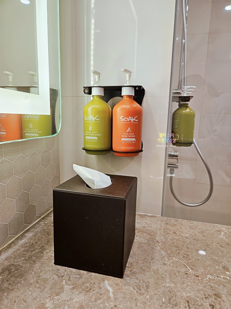 세면대에 별도의 여유공간이 있지만 무료 어매니티가 차지하는 공간이 있다는 점 참고하자. 세면대가 넓은 것은 아니지만 좁지도 않은 편인데 무료 어매니티가 차지하는 공간이 있어서 그리 넓다는 생각이 들지 않는다는 생각이 들 수 있다.
