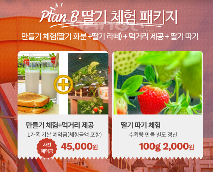 - 입장료: 딸기체험 45,000원(만들기+먹거리제공/딸기 따기 불포함)+ 딸기따기 체험 12월 기준 100g 2,500원