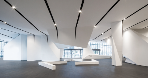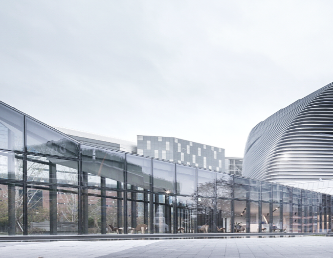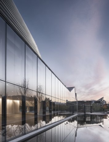 래미안갤러리 외관은 한국 지형의 아름다움을 모티프로 하여 전통과 현대, 자연과 첨단의 조화를 추구하는 래미안의 철학이 담겨 있다.