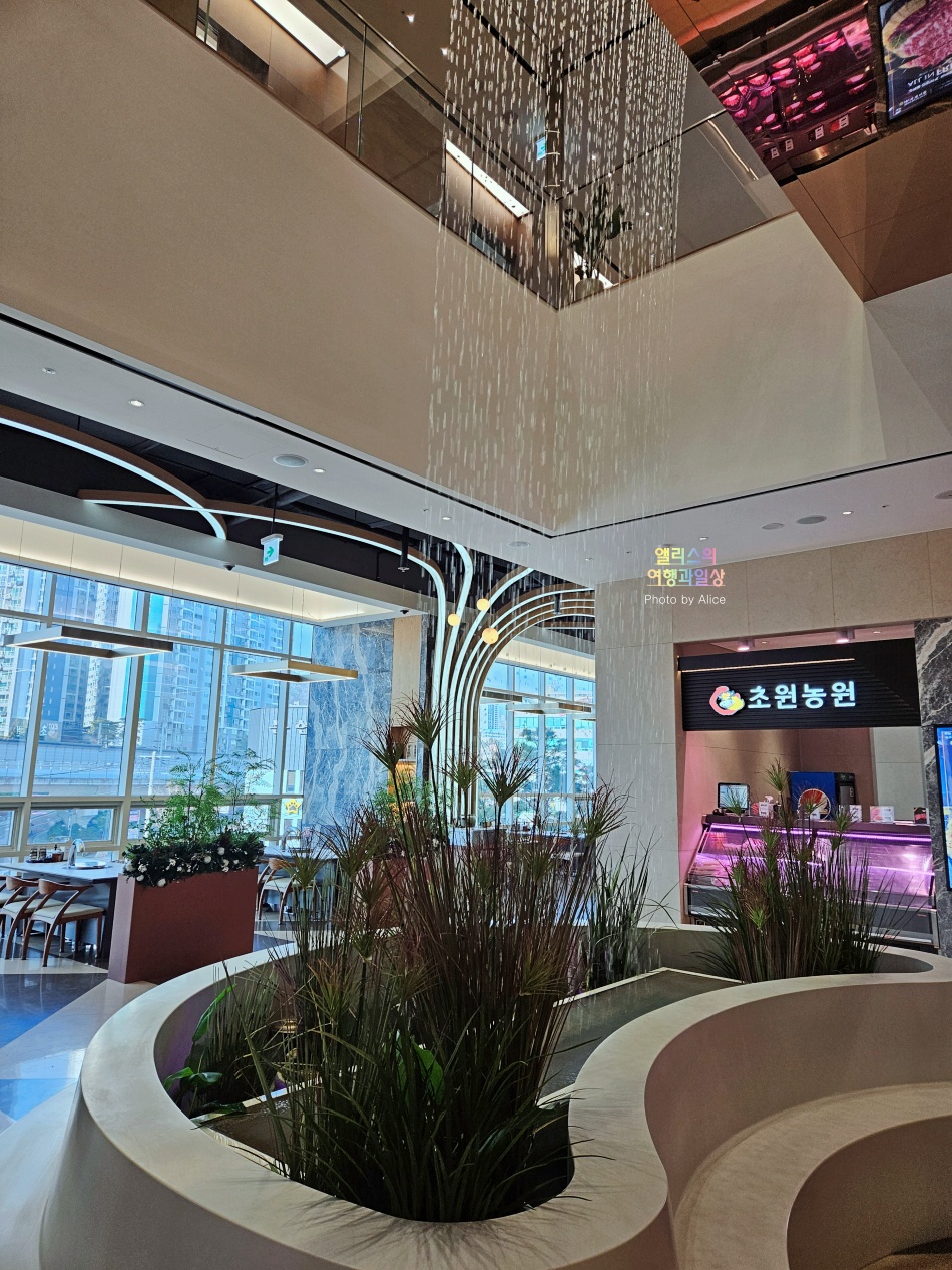 굉장히 넓은 덕분에 사람들이 몰려도 수용인원이 충분할 것 같고, 인상적이게도 위에서 떨어지는 폭포가 있어서 숯불이 오가는 현장임에도 건조하거나 더운 느낌이 한결 덜했다.
