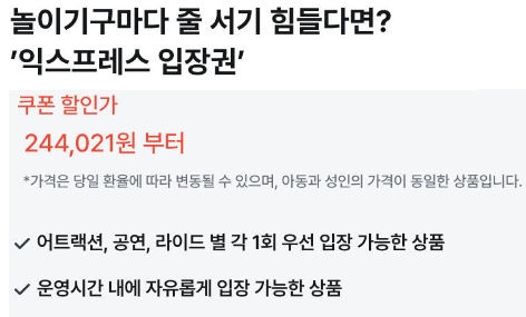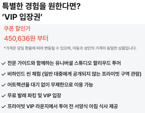 다소 높은 입장료인 LA유니버셜 스튜디오 할리우드 입장권을 보다 저렴하게 이용할 수 있는 특가 프로모션이다. 할인쿠폰은 당장 적용되지 않지만 그것과 별개로 할인된 가격으로 등록되어있으니 다른 곳과 비교해서 이용원하는 날짜 입장권이 저렴하다면 이용해보자.