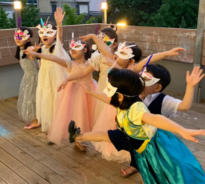 파티에 만난 새로운 친구들과 영어로 대화하는 게 점점 자연스러워질 것이다. 영어가 익숙한 아이도 아직 어려운 아이도 모두 참여할 수 있다. 즐거운 놀이를 통해 영어 자신감을 얻어갈 수 있도록 목표로 하는 수업이다.
