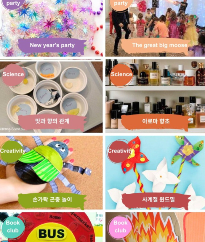 "파티, 창의놀이, 북클럽, 과학" 이 모든 수업을 하루에 전부 경험할 수 있다. 깊이감있는 수업에서 아이들은 영어에 대한 흥미와 호기심이 더울 늘어나게 된다. 다양한 수업을 경험하면서 아이들의 스피킹 기회도 더 많아지는 것이 장점이다.