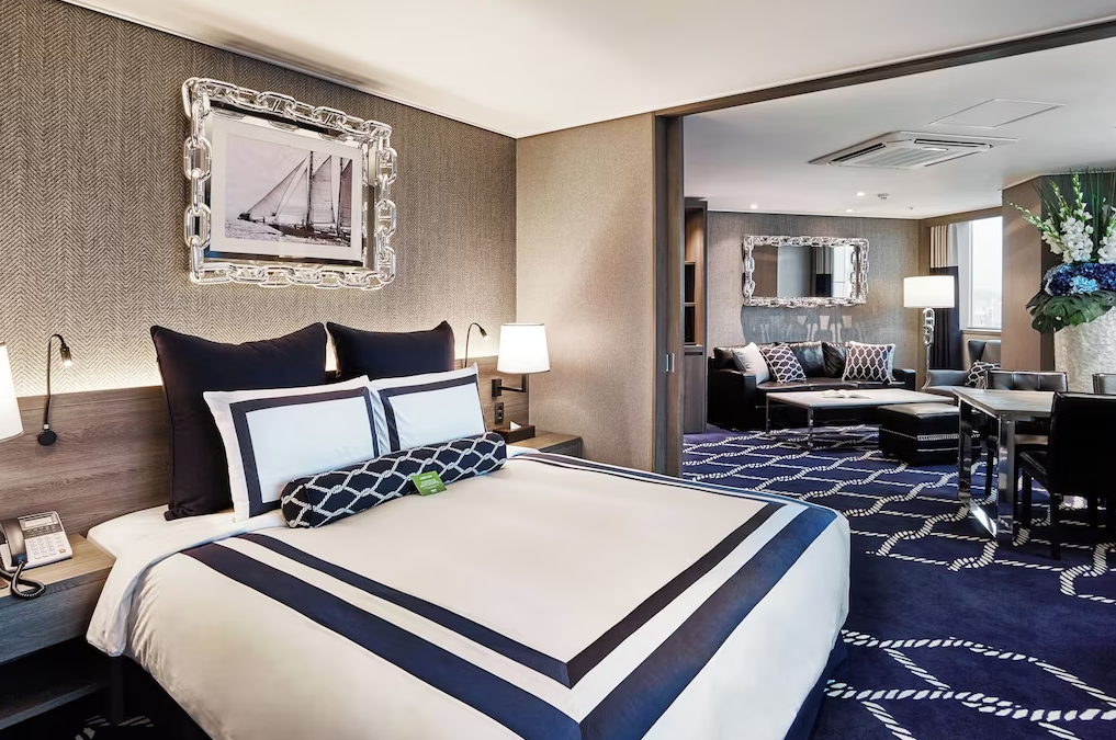 객실 정돈 및 청결상태 양호하며 모션베드, 자동커튼 등으로 편리하게 이용할 수 있다. 객실에서 불꽃놀이 및 드론라이트쇼 감상 가능하다.