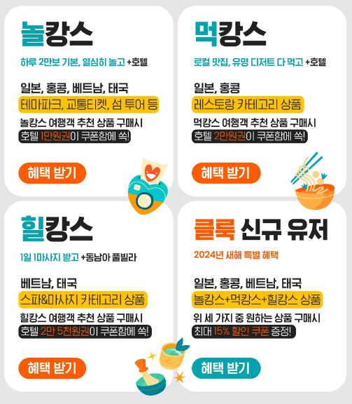 일본, 홍콩, 베트남, 태국 테마파크/교통티켓/섬투어등 놀캉스를 위한 상품 구매시 호텔 1만원 할인쿠폰을 받을 수 있다.