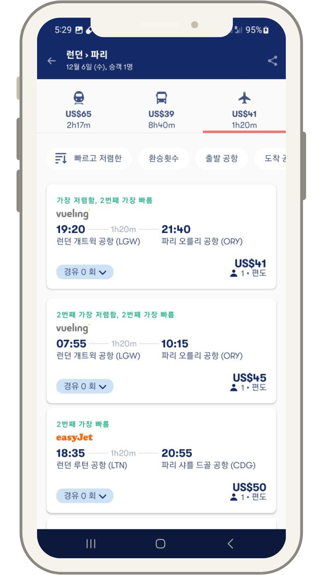 예를 들어 런던-파리 일정으로 이동하고 싶다면 오미오에서 간편하게 검색해서 원하는 교통수단을 선택할 수 있다.