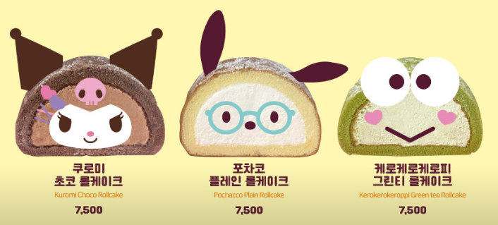 · 쿠로미/포차코/케로케로피 롤케이크: 귀여운 캐릭 눈코입이 붙어있는 캐릭터 조각 롤케이크