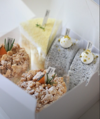 · 단호박 크럼블 설기케이크: 뽀얀 백설기속에 단호박이 있고 크림치즈로 부드럽게 먹을 수 있다. 그 위에 바삭한 크럼블까지!
