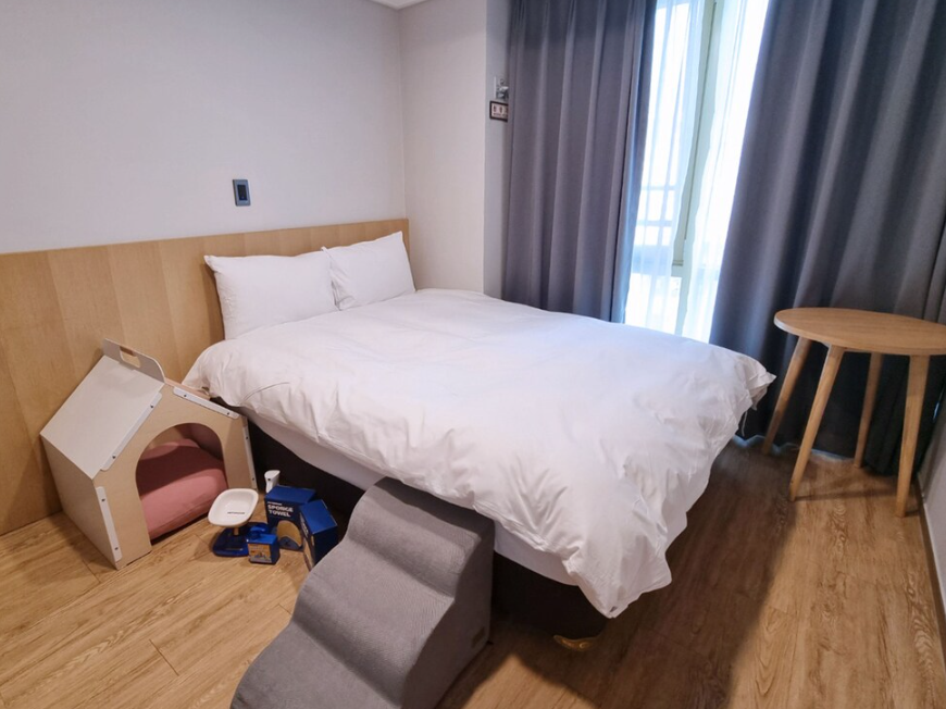 무풍에어컨 설치된 객실은 좁지만 창밖 보이는 풍경이 좋다. 반려동물 동반 객실도 있어서 반려동물과 여수를 여행할 계획이라면 딱 좋다. 19층 루프탑 뷰도 좋다.