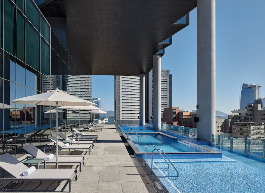 이순신광장 차로 10~10분정도 소요되고 5층과 6층에 있는 야외 수영장있고 글램핑 BBQ시설도 있따.