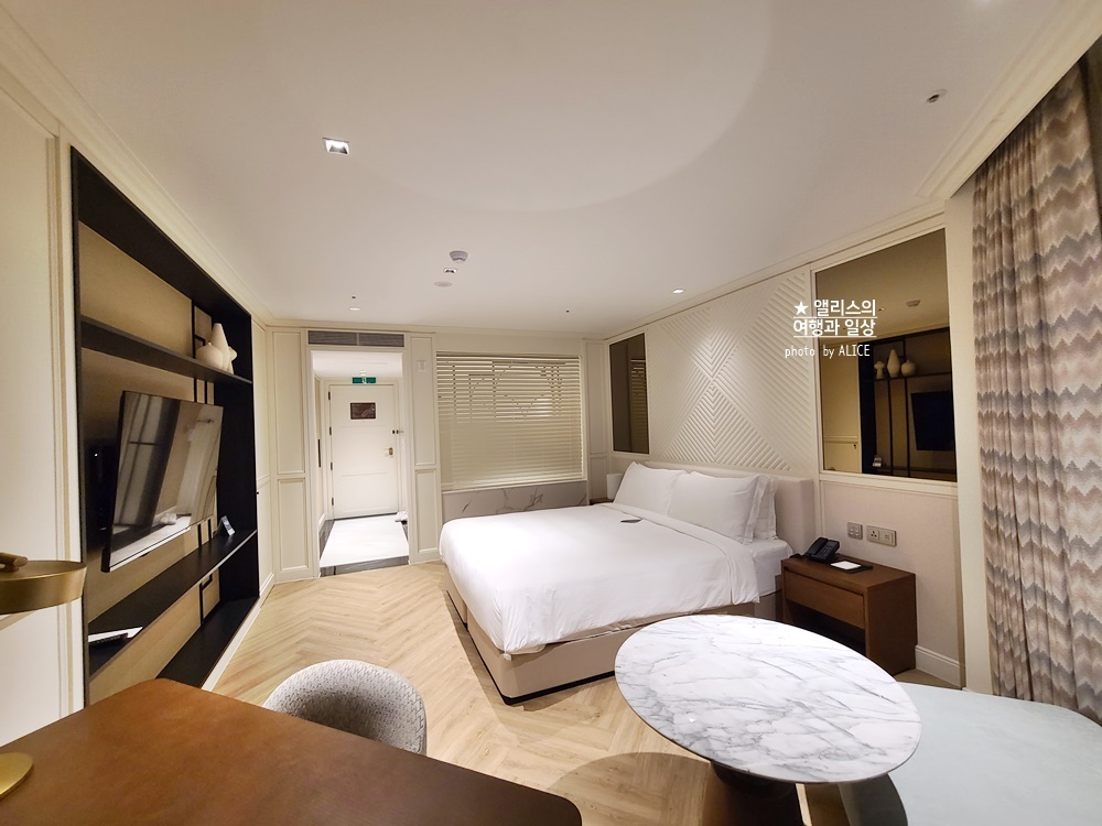 짧은 복도식 구조의 코너객실이었다. 일반 디럭스 더블룸에 바다뷰가 잠시 일부 보이는 구조라서 파샬 오션뷰라는 명칭이 붙어있는 객실이다. 특히 코너에 소파를 두고 책상과 이어지는 공간이라 공간 활용이 잘 되어있고 오션뷰보다는 가격이 저렴하고 시티뷰보다는 오션뷰를 충분히 즐길 수 있는 것이 특징이다.