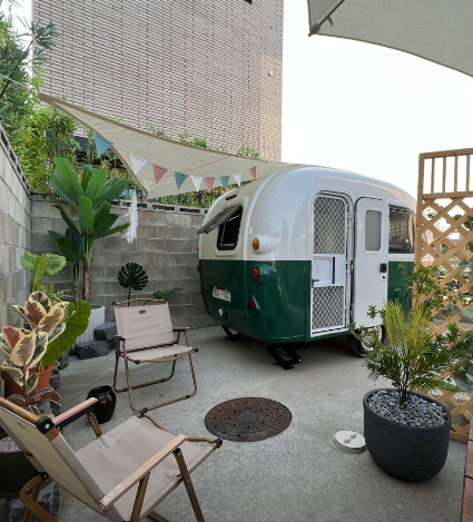 이국적인 느낌의 넓은 마당에는 넓은 야외테이블과 바베큐그릴이 준비되어 있다. 실내 전기그릴은 무료로 사용가능하다.