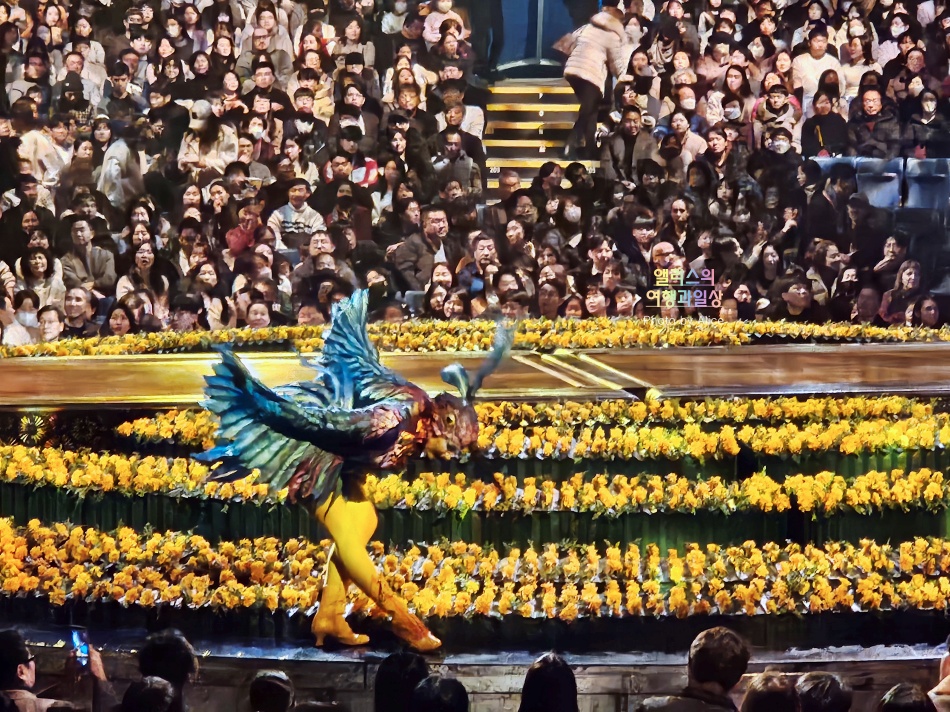특히 와이어를 일명 똥머리에 그대로 걸고 양 팔을 자유롭게 움직이면서 회전하는 모습은 내가 그 동안 봐왔던 규모가 상당한 와이어 공연 (댄싱워터, 일렉트론, 펄오브드래곤등)과 전혀 다른 수준과 속도감이었다. 그냥 찢었다.라는 표현이 맞을만큼 엄청난 회전속도와 와이어가 머리에 걸려있는게 신기할 따름이었다.