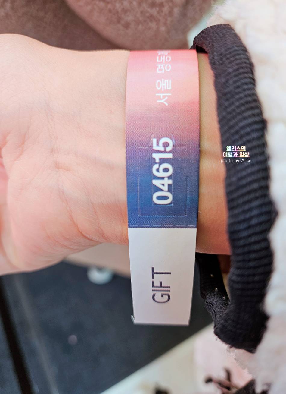 GIFT가 적힌 종이팔찌를 매고 잠시 기다리면 엘리베이터를 타고 팝업스토어 내부로 이동가능하다.