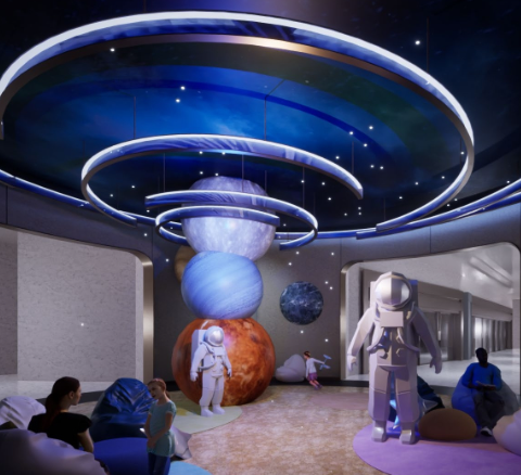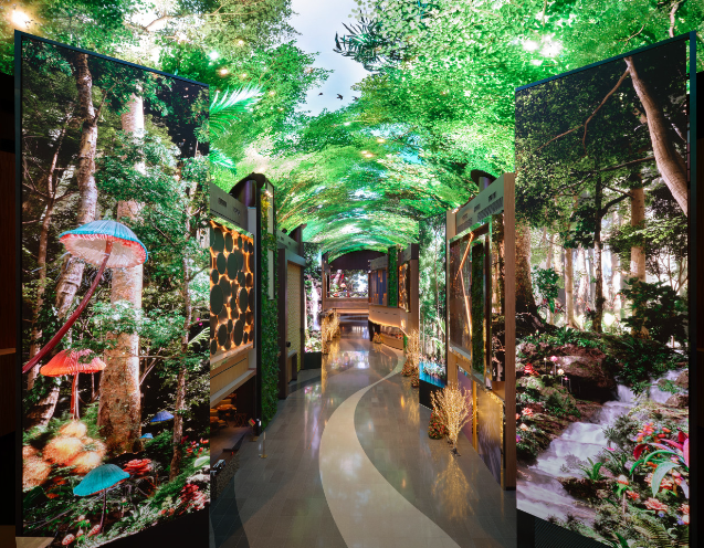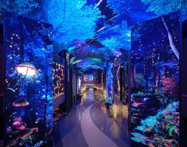 길이 150m에 달하는 천장과 높은 벽면을 초고화질 LED로 가득 채워 초현실적인 장면을 현실감 있게 구현한 몰입형 디지털 엔터테인먼트 거리.고해상도 LED와 천장으로 뻗어 있는 초대형 기둥의 LED는 초현실적인 디지털 콘텐츠를 몰입감 있게 구현한다.
