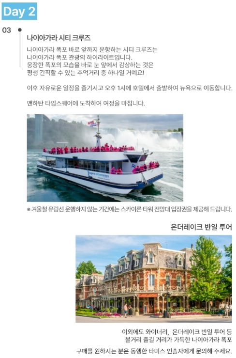 가이드비는 물론 왕복 교통비, 숙박비(3성급), 나이아가라 시티 크루즈까지 포함된 1박 2일 상품이다.
