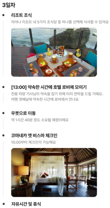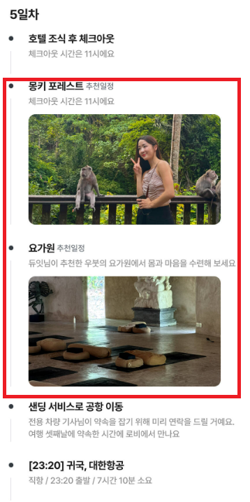 보다시피 대부분 자유시간으로 구성되어있으면서 고급 리조트로 포진된 일정이라 쉼+발리여행을 충분히 내가 원하는 스타일대로 즐길 수 있다. 여기에 핵심 투어인 오전 지프투어를 통해 발리의 아름다운 자연과 농장을 돌아볼 수 있어서 최소한의 투어와 충분한 자유시간이 보장되는 것이 장점이다.