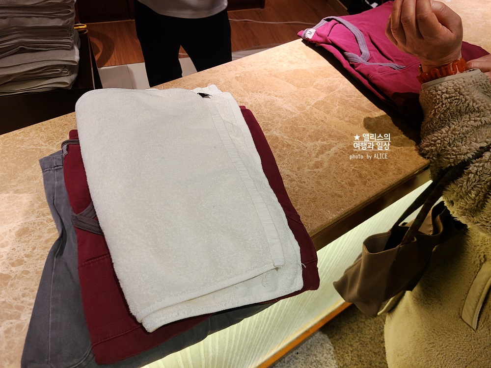 신발을 먼저 벗어서 신발장에 넣은 뒤에 직원으로부터 수건과 찜질복을 받는다.