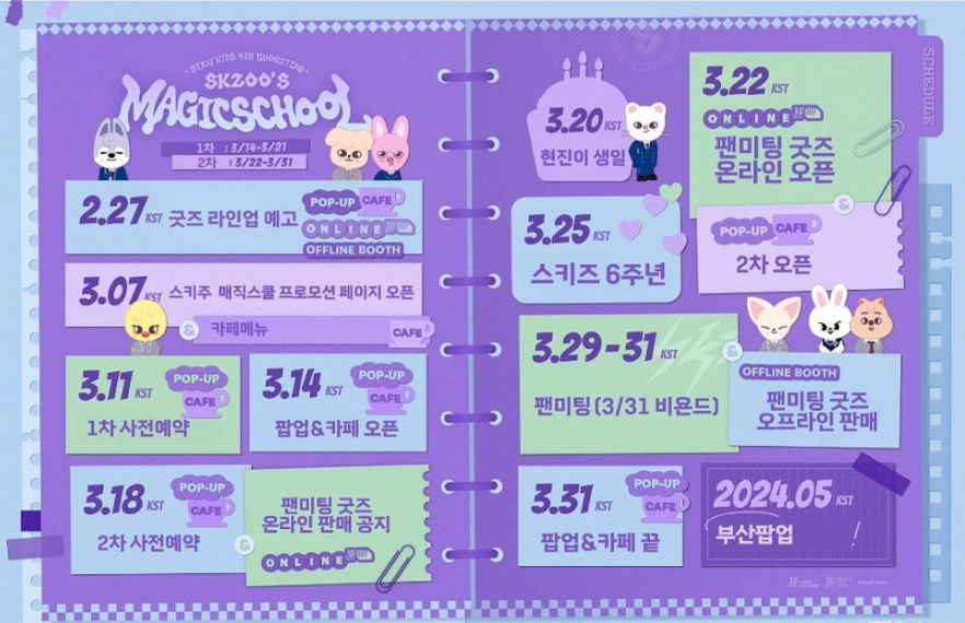 JYP엔터테인먼트는 3월 14일부터 31일까지 성수 AP AGAIN과 사운드웨이브 합정점에서 스트레이 키즈와 각 멤버들을 모티브한 동물 캐릭터 스키주를 테마로 한 팝업 스토어 <스트레이 키즈 x 스키주 팝업스토어 앤드 카페> <스키주의 마법 학교>를 운영한다.